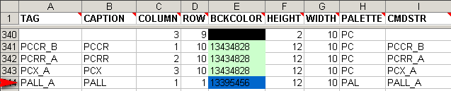 Definiamo il TAG - deve essere unico - con PALL_A, il testo del pulsante con PALL, coordinate e dimensioni del pulsante e il nome della scheda (PALETTE) con PAL. Infine passiamo il nome del componente PALL_A al programma (CMDSTR). Salviamo il file di EXCEL e usciamo.