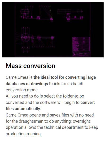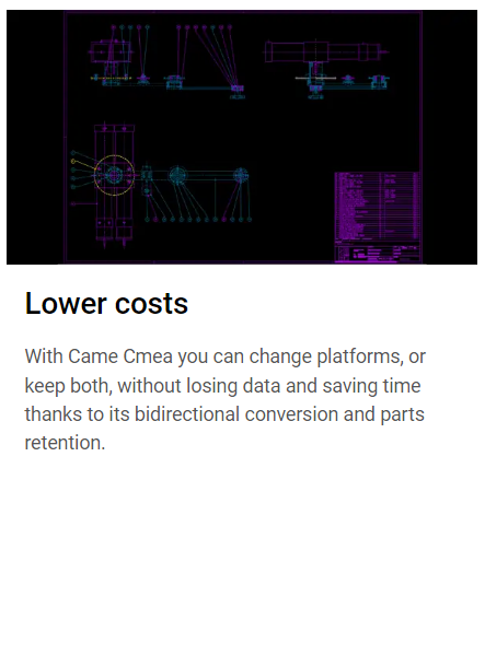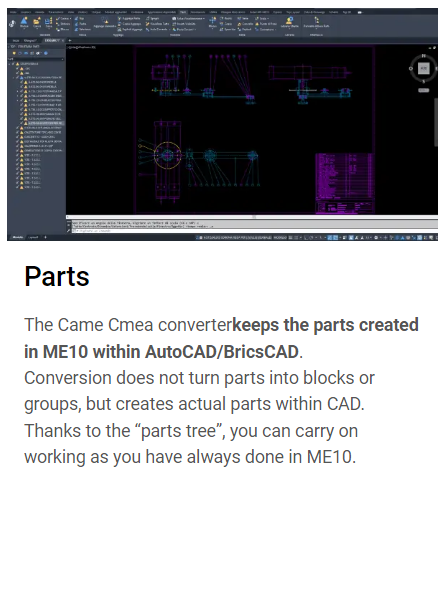 Came Cmea is a converter that makes it easy to open and manage files from ME10 to AutoCAD and BricsCAD.