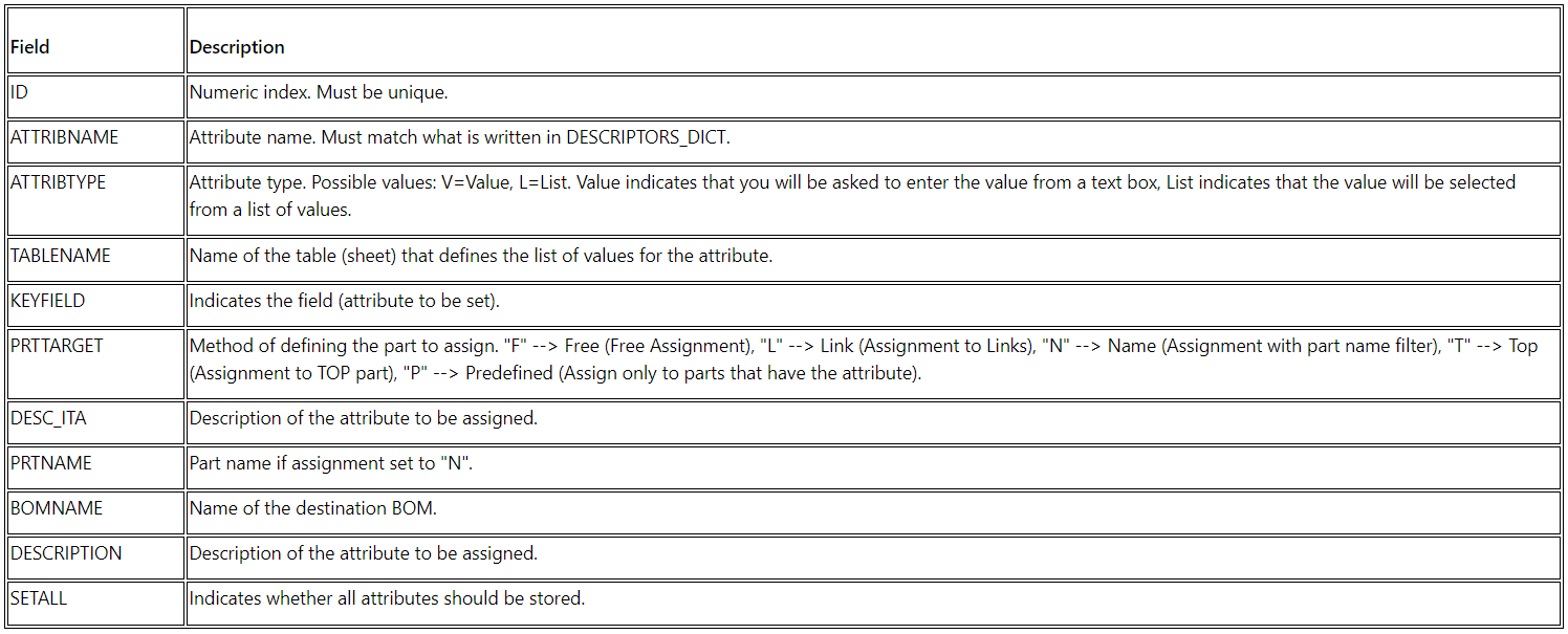 The definition of these attributes goes through a series of tables. Let's look at them in order starting from the DESCRIPTORS_DICT table that we already know. In this table we have seen that each row defines a family of components. We can decide whether each family will receive the assignment of an attribute by adding the column with the name of the attribute and indicating with 1 or 0 in the cell of the row whether the family can receive the assignment of the attribute.
