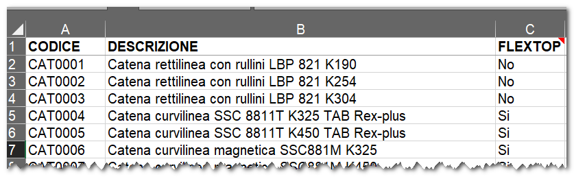 The column with the value indicated in KEYFIELD must be defined. In the example the columns CODE and DESCRIPTION are sufficient. Some tables may require special columns. For example, for automatic chain assignment it is necessary to fill in the FLEXTOP column in the chain attributes.