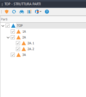 L'albero delle parti può essere visto come una struttura gerarchica che indica i rapporti esistenti tra le singole parti. Grazie a questa natura gerarchica si parla di diversi livelli di indentazione della struttura delle parti. Al livello più alto si trova la parte TOP, la quale ha come figli parti al primo livello, le quali hanno come figli parti al secondo livello, ecc..