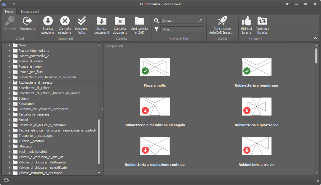 La libreria è composta da figurini (simboli) memorizzati come singoli files .dwg ognuno rappresentante un simbolo. Ogni simbolo verrà caricato nel disegno finale come parte. Parte dei simboli all’interno della parte sono composti da un blocco con attributi. QS Informatica fornisce una libreria cloud di simboli disponibili per l’utente.