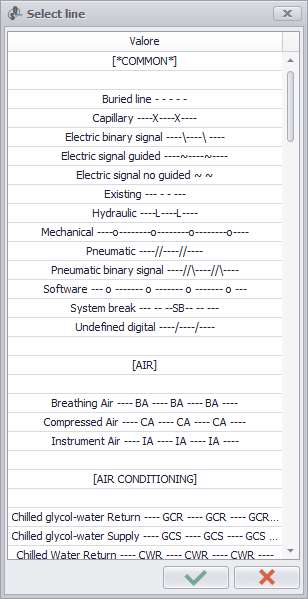 Consente di tracciare una linea strumentale. E' un collegamento di tipo diverso dalle tubazioni. Viene mostrato un dialogo con l'elenco dei tipi di connessione disponibili.