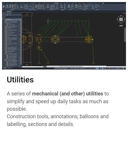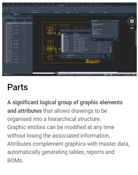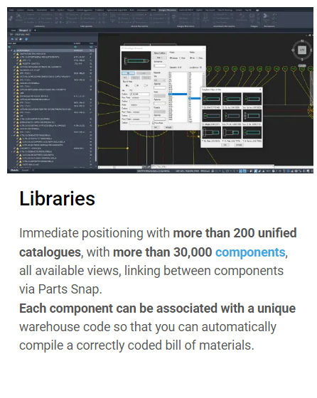 TOP software integrates mechanical libraries, simplifies the management of balloons and title blocks, creates the component BOM with just one click and offers many additional mechanical commands.