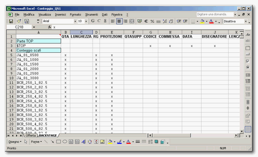 Il foglio dati a matrice prevede la definizione del filtro parti sulla prima colonna, mentre la prima riga definisce gli attributi da estrarre. Per ogni riga del foglio occorre indicare gli attributi da estrarre inserendo una 'x' nella cella in corrispondenza alla colonna attributo.
