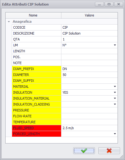 Eventualmente modificare/aggiungere attributi (questa operazione può essere eseguita anche successivamente). È consigliato compilare tutti gli attributi evidenziati in fase di definizione del fluido.