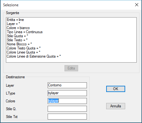 In the example above, you want to transform all the line entities, of white color and LineType CONTINUOUS (Source), described in the upper part of the window, on a layer called contour (Destination) by setting its color and LineType to bylayer. To set the different fields in the "Source" part of the window, you need to select the row to be modified and press the "Edit" button, or double-click on the row concerned. By doing so, a new window appears that describes (on the right side: List) all the various properties that can be added (on the left side: Selection) to the previously selected field by pressing the "Add" button.
