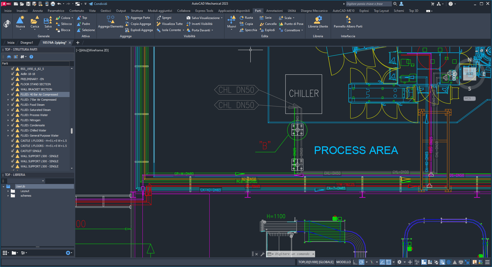 The module is composed of a library of symbols and specific features for drawing flowcharts, linear piping drawings and layout drawings.