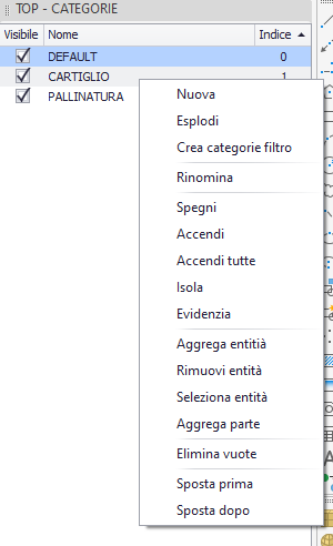 - Permette di modificare la visibilità delle entità grafiche associate alla categoria. Lo stesso comando può essere eseguito premendo sul tasto checkbox a lato della categoria. Il checkbox viene anche utilizzato per segnalare l'attuale stato della categoria.