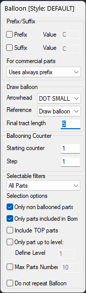 The dialog allows you to establish whether to use a prefix or a suffix when ballooning the Commercial parts, as well as setting the value to use.
