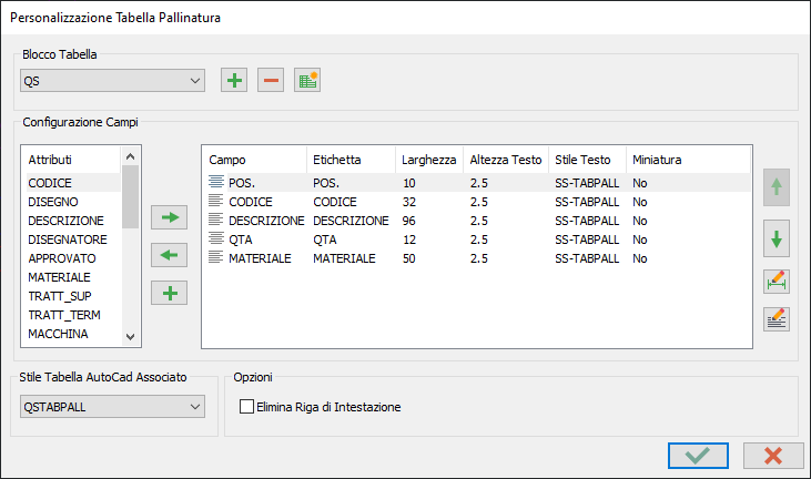 Fornisce all'utente un comodo strumento per la definizione della tabella che QS utilizza per la pallinatura. Questo strumento agisce solo sull'oggetto tabella nativo del CAD base, e non su quella disegnata per blocchi.