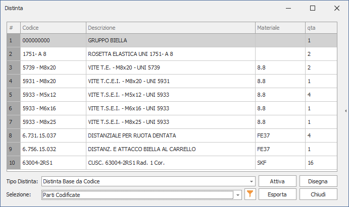 By acting on the “Selection” list it is possible to apply particular filters to the parts list obtained from the bill of materials.