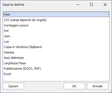 With the “Export” button you select the desired method for the export format of the list (e.g.: Print, ASCII delimited, HTML, etc.).