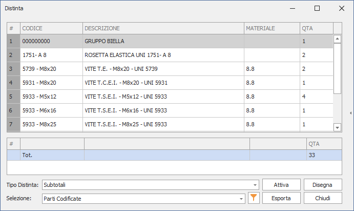 If a subtotal is selected for a specific list , when the Topl_Distinta command is started, a further summary containing the subtotals will be added to the dialogue under the list. In the example below, the subtotal has been selected for the QTA (Quantity) attribute.