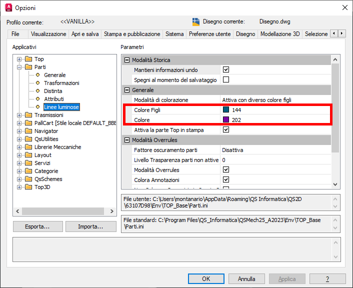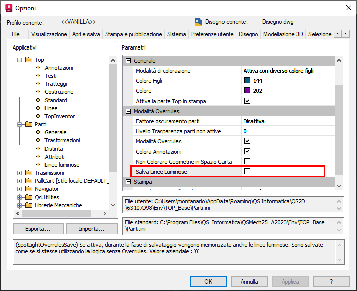 Per fare in modo che la colorazione delle linee luminose sia visibile a chi non ha la Qs Mechanical Suite installata è possibile forzare il salvataggio del colore delle linee luminose. Infatti quando questa opzione è attiva, al momento del salvataggio le geometrie vengono fisicamente colorate del colore con cui le vediamo visualizzate. A seconda delle dimensioni del disegno questa operazione può richiedere molto tempo.