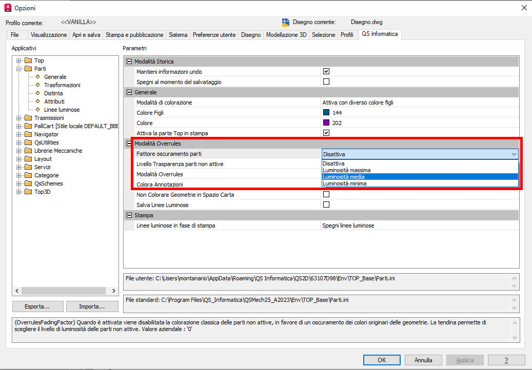 Per aggirare il problema di risultati diversi a seconda della parte attiva è possibile forzare l'attivazione della parte TOP prima della stampa da menu delle opzioni di Qs Mechanical Suite.