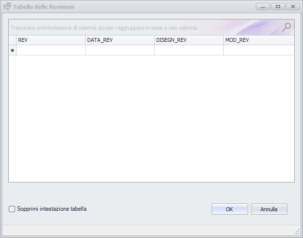 Una volta lanciato il comando verrà proposta all'utente la seguente interfaccia, che ricalca quella che poi è la struttura della tabella che verrà inserita. Il comando effettua una ricerca della tabella delle revisioni nel disegno corrente, e se la trova ne ripropone il contenuto in modo che l'utente possa modificarla o integrarla.