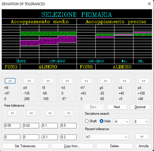 If you enter the tolerance command and select as reference dimension an angular dimension, a dialogue will be displayed where to insert the tolerance on the angle as for the tolerances on the lengths. Insert free tolerances in the top section, while at the centre, for a quicker selection, there is a drop-down menu including the last tolerances inserted by the user.