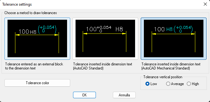 IMPORTANT: the tolerances referring to texts are always inserted as external blocks. In this dialogue, the button at the bottom left changes the tolerance text colour, while the radio button on the right changes the height of the text position respect to the dimension line.