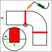 The command allows you to draw a weld in 3D. Welds are geometrically represented as "rings" with a rectangular cross-section of Width (A) and Thickness (B) on a pipe with Diameter (D).